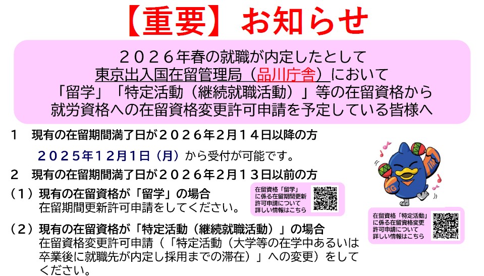 2026年の春入社、多くは4月入社の方が該当するかと思いますが、例年、東京出入国在留管理局(品川)では入社に間に合うように前年12月より就労ビザへの変更申請を受け付けております。早めに申請を済ませて残りの期間を安心して過ごしましょう!